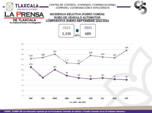 El mismo reporte indica que, en lo que va de 2025, el robo de vehículo automotor en el estado muestra una tendencia descendente, y por debajo de los niveles observados el año pasado. Mientras en septiembre de 2024 se registraron 176 casos, en septiembre de este año la cifra fue de 62.