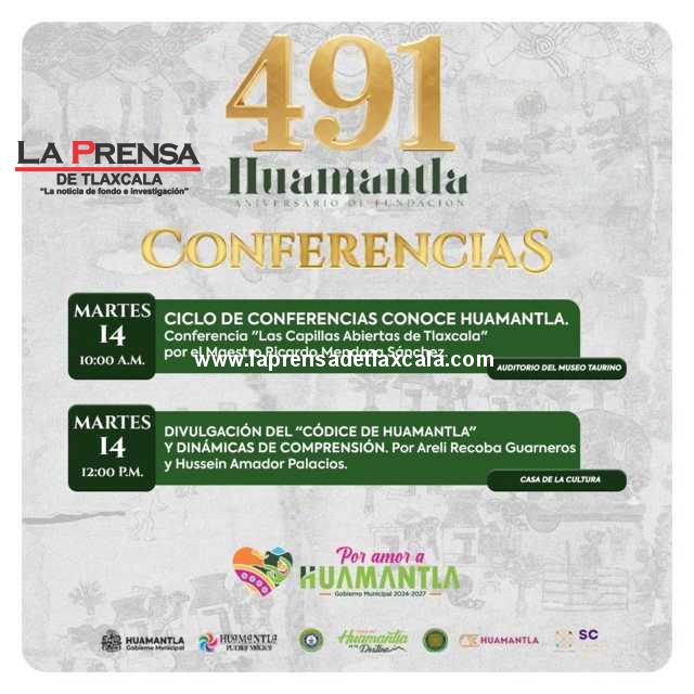 El Honorable Ayuntamiento de Huamantla invita a la ciudadanía a sumarse a la celebración del 491 aniversario de la fundación de la ciudad, a través de un ciclo de conferencias, divulgación cultural y cine, promoviendo la historia, el arte y la identidad de nuestra comunidad.
