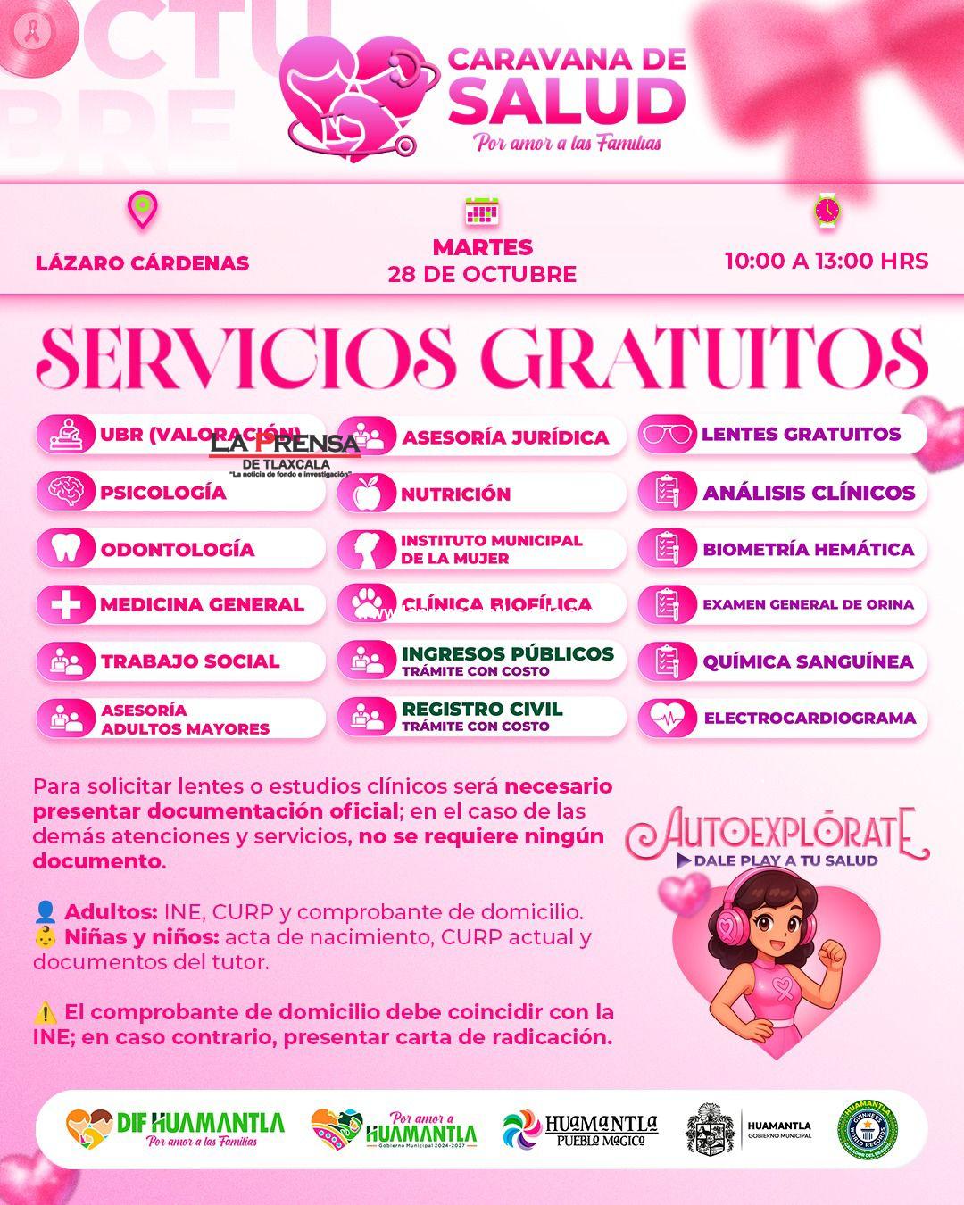 El Gobierno Municipal de Huamantla, a través del Sistema Municipal para el Desarrollo Integral de la Familia (SMDIF), invita a la ciudadanía a participar en la Caravana de la Salud, que se llevará a cabo este martes 28 de octubre, de 10:00 a 13:00 horas, en la comunidad de Lázaro Cárdenas.