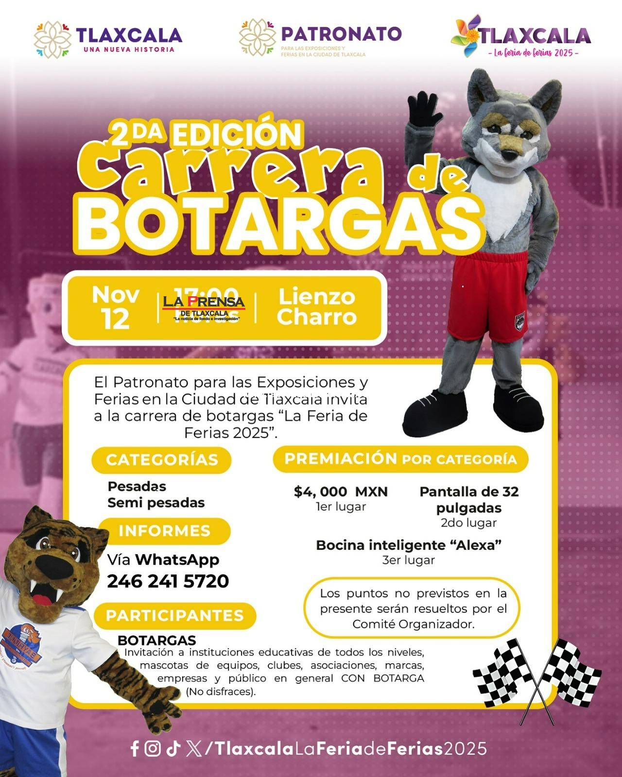 La carrera de Botargas, en su segunda edición, se llevará a cabo el 12 de noviembre, a las 17:00 horas en el Lienzo Charro. Podrán participar instituciones educativas, clubes, empresas y público en general con botargas en las categorías pesada y semi pesada.
