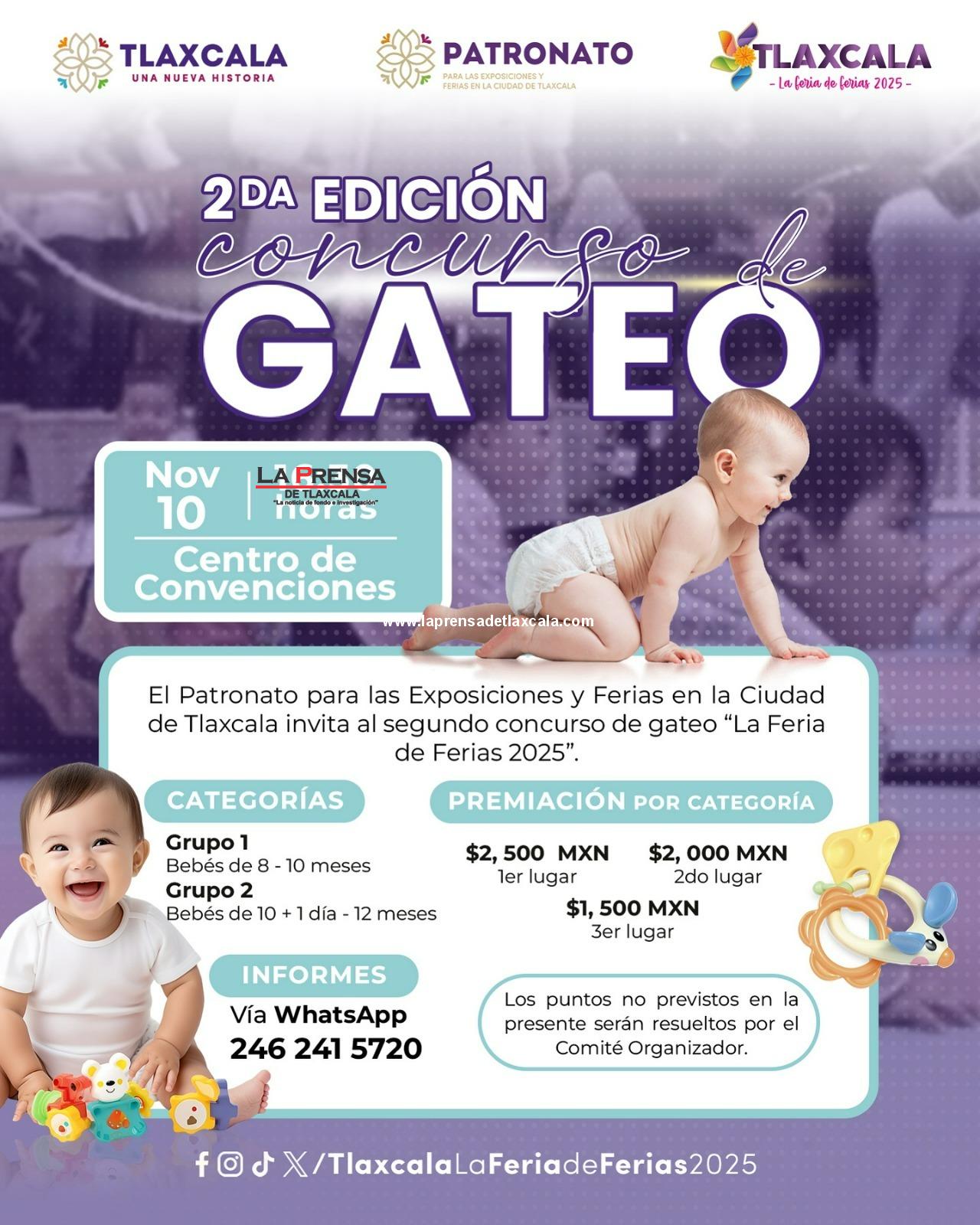 El concurso de gateo se realizará el 10 de noviembre a las 16:30 horas en el Centro de Convenciones, e incluye las categorías de bebés de 8 a 10 meses, y bebés de 10 meses y un día a 12 meses. Los tres primeros lugares recibirán premios en efectivo de 2 mil 500, 2 mil y mil 500 pesos, respectivamente.
