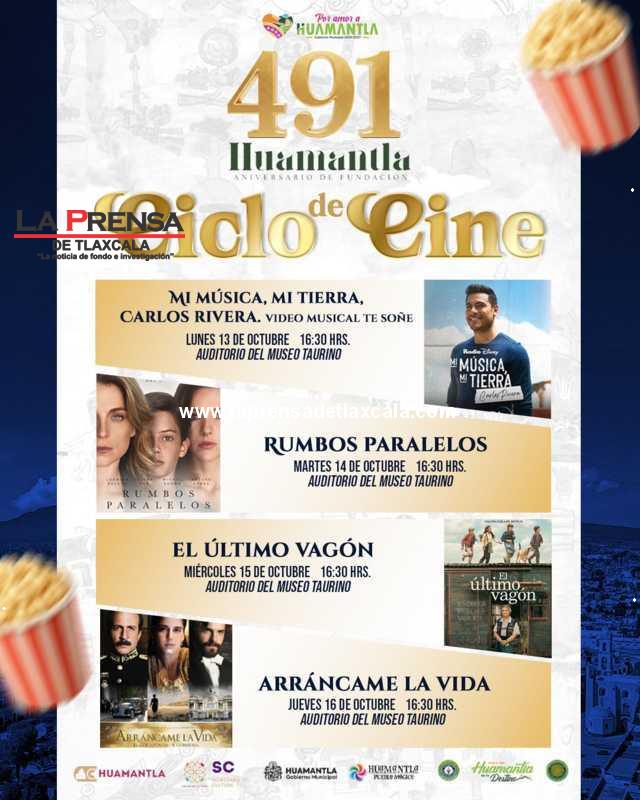 El H. Ayuntamiento de Huamantla, a través de la Dirección de Turismo, Cultura y Desarrollo Taurino, invita a la ciudadanía a disfrutar del Ciclo de Cine que se llevará a cabo del 13 al 16 de octubre en el Auditorio del Museo Taurino, a partir de las 4:30 de la tarde, como parte de las actividades conmemorativas por el 491 aniversario de la fundación de Huamantla.