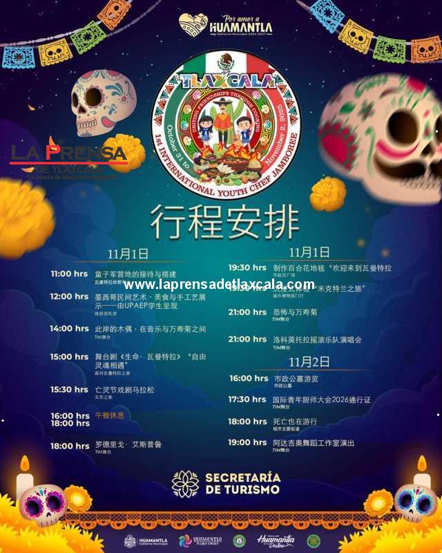 El itinerario —presentado en español, inglés, francés y chino— contempla actividades culinarias, talleres, muestras gastronómicas, recorridos culturales y la integración de delegaciones internacionales al festival Vida Huamantla, donde destaca la elaboración del tapete monumental de la Flor de Lis, símbolo del escultismo.