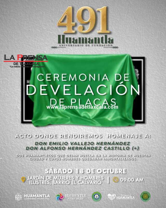 Huamantla, Tlax.- Como parte del bando solemne de actividades conmemorativas por el 491 aniversario de la fundación de Huamantla, el H. Ayuntamiento, encabezado por el presidente municipal Salvador Santos Cedillo, invita a la ciudadanía a la develación de placas en homenaje a Don Emilio Vallejo Hernández y Don Alfonso Hernández Castillo (+).