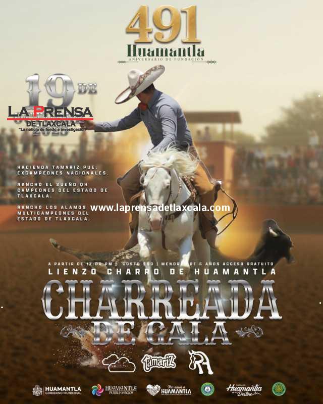 Huamantla, Tlax.- En el marco del 491 aniversario de la fundación de Huamantla, el Ayuntamiento que encabeza el presidente Salvador Santos Cedillo invita a la ciudadanía a disfrutar de una de las tradiciones más representativas del pueblo mexicano: la Charreada de Gala, que se llevará a cabo este domingo 19 de octubre a partir de las 12:00 p.m. en el Lienzo Charro de Huamantla.