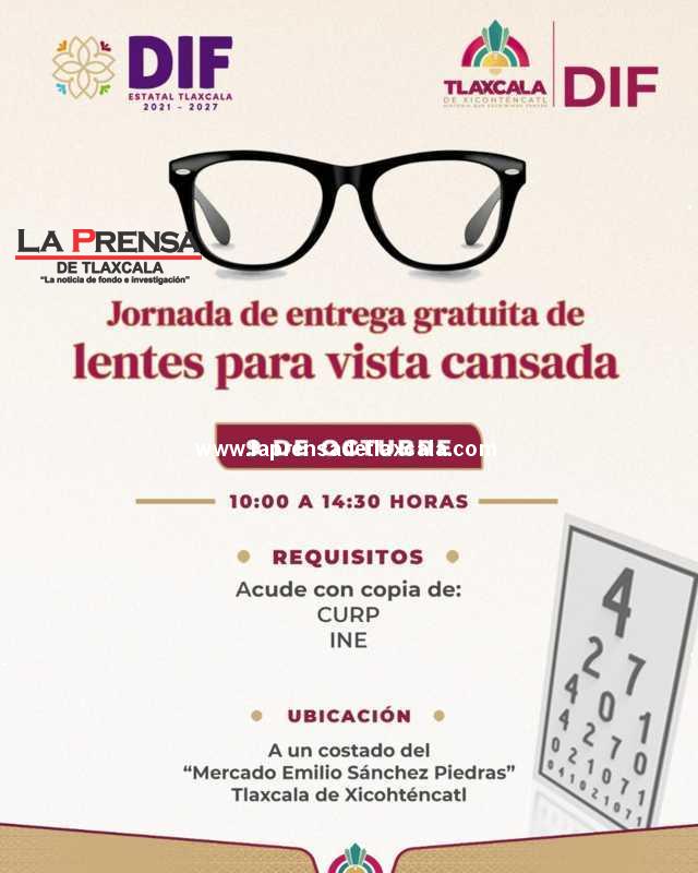 El Sistema Municipal para el Desarrollo Integral de la Familia (SMDIF) del Ayuntamiento capitalino invita a una jornada de entrega gratuita de lentes, la cual está dirigida a personas con vista cansada, que tendrá lugar este jueves 9 de octubre.