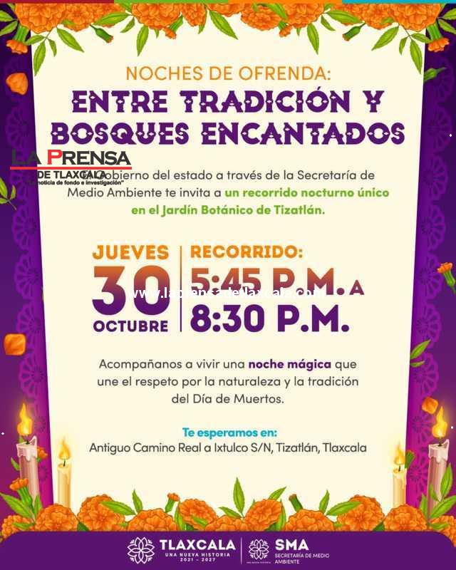 La Secretaría de Medio Ambiente (SMA) invita a la ciudadanía a disfrutar de “Noches de Ofrenda: Entre Tradición y Bosques Encantados”, un recorrido nocturno que se llevará a cabo este 30 de octubre en el Jardín Botánico de Tizatlán, de 17:45 a 20:30 horas, donde el arte, la tradición y la sustentabilidad se unirán para rendir homenaje a una de las celebraciones más emblemáticas de México.