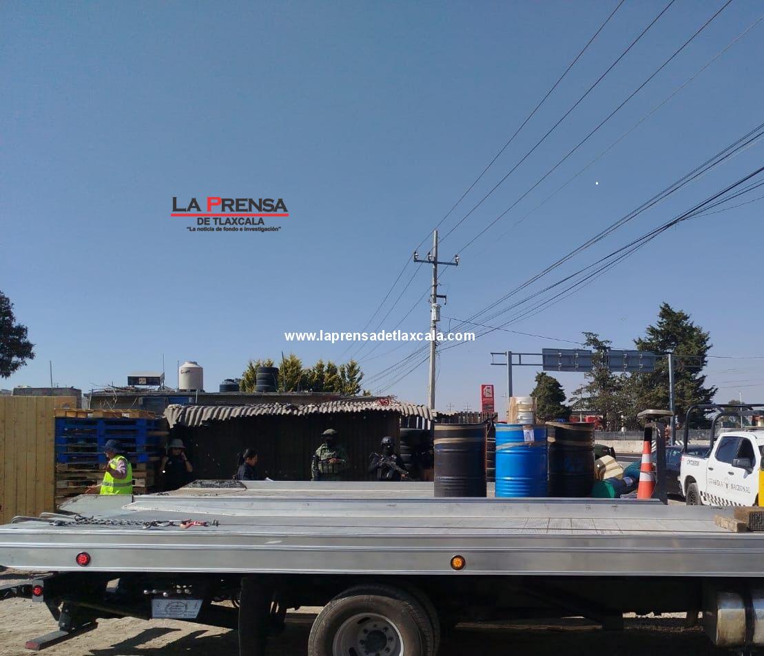 La Guardia Nacional, en coordinación con el Ejército Mexicano y autoridades locales, ejecutó este jueves un cateo en un predio dedicado aparentemente a la venta de tarimas, ubicado en el kilómetro 140 de la carretera México-Veracruz, donde se localizó un centro ilegal de almacenamiento y distribución de combustible robado.