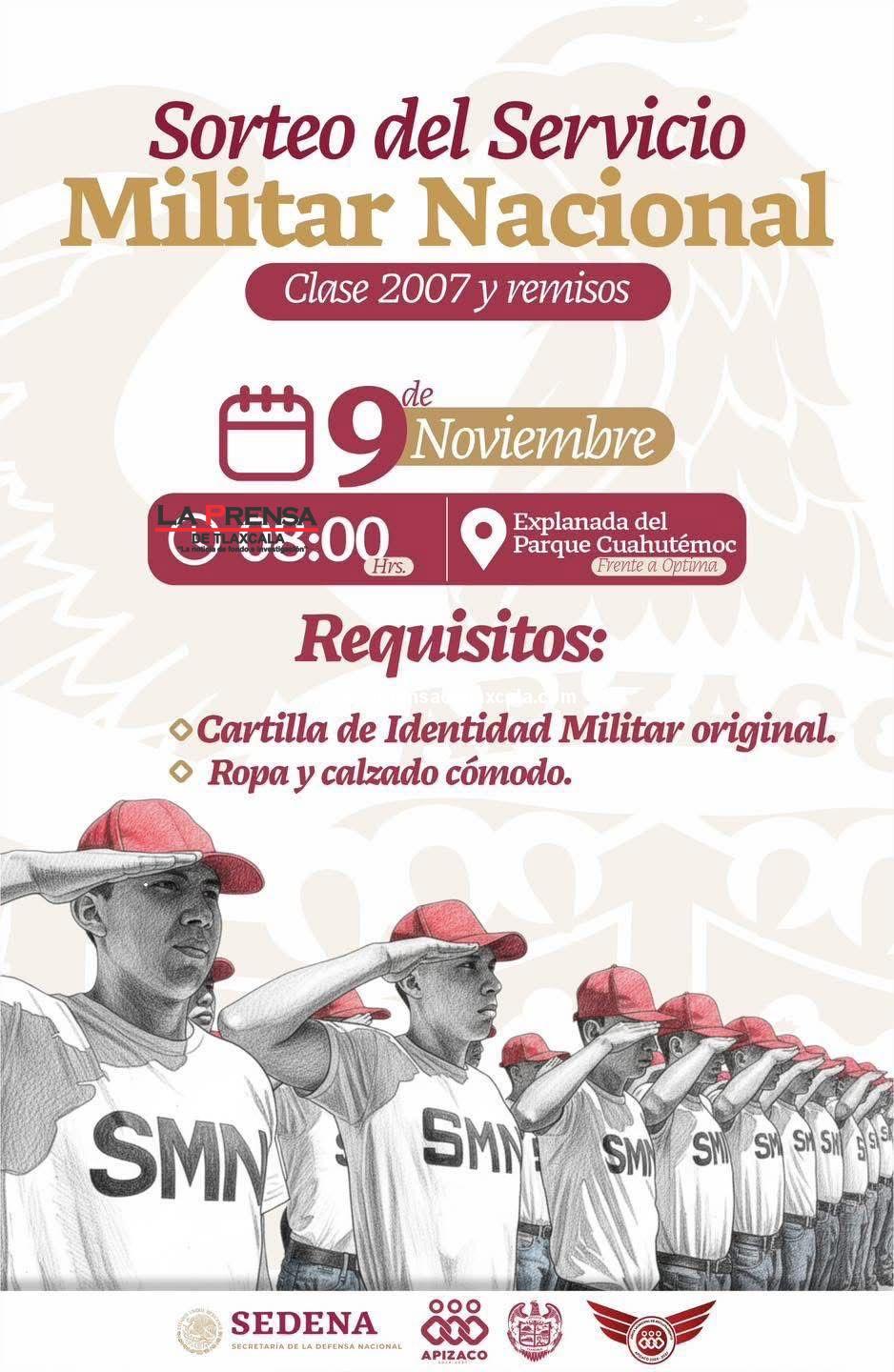 El Gobierno Municipal de Apizaco, en coordinación con la Secretaría de la Defensa Nacional (Defensa) a través de la 23/a Zona Militar, convoca a los jóvenes que tramitaron su cartilla de identidad militar durante el presente año, clase 2007 y remisos, a participar en el sorteo del Servicio Militar Nacional, que se realizará el domingo 9 de noviembre de 2025, a las 08:00 horas, en la explanada del parque Cuauhtémoc.
