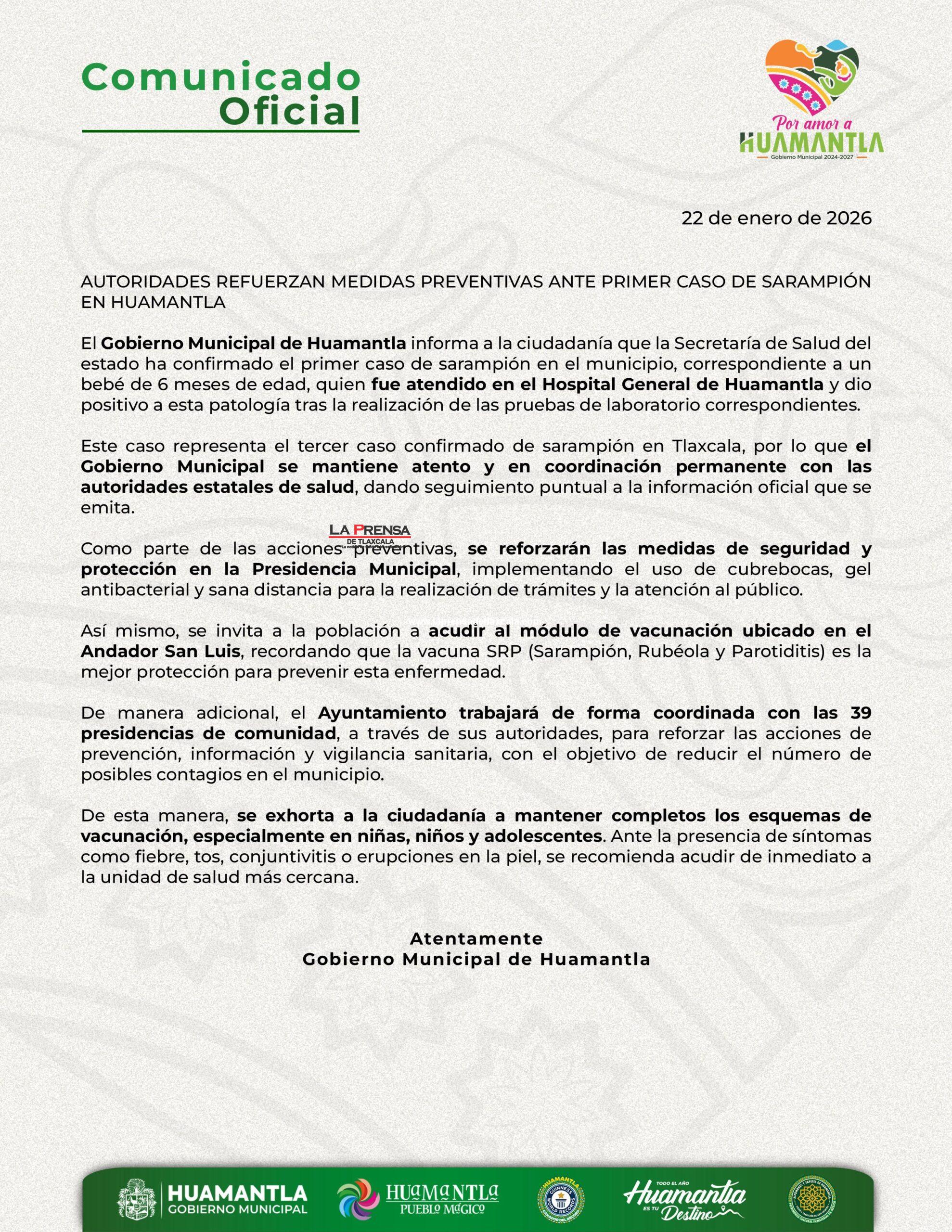 El Gobierno Municipal de Huamantla informa a la ciudadanía que la Secretaría de Salud del estado ha confirmado el primer caso de sarampión en el municipio, correspondiente a un bebé de 6 meses de edad, quien fue atendido en el Hospital General de Huamantla y dio positivo a esta patología tras la realización de las pruebas de laboratorio correspondientes.