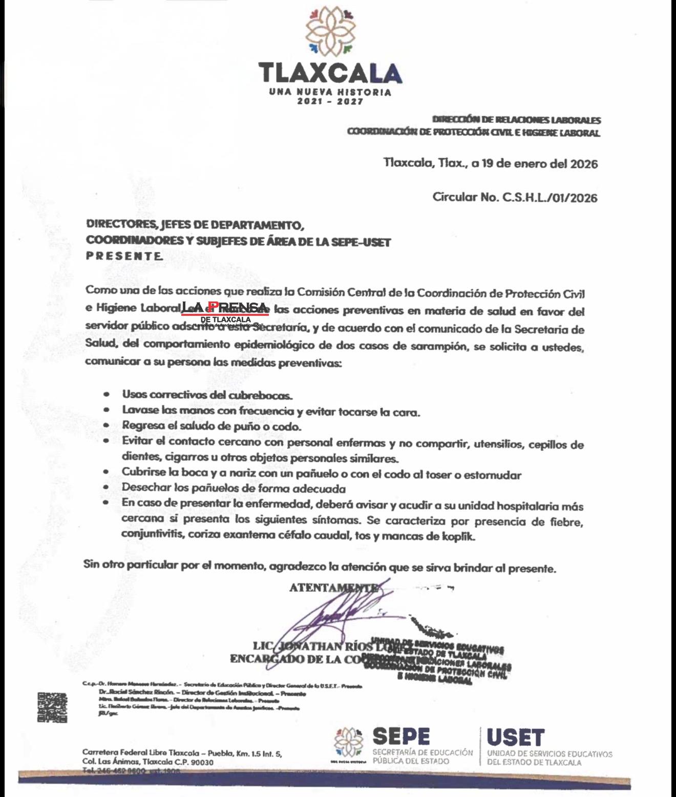 La omisión resulta aún más delicada porque no se trata solo de una recomendación federal. El 19 de enero, el área de Protección Civil de la propia dependencia educativa emitió la circular C.S.H.L/01/2026, en la que se establecen acciones preventivas en materia de salud para el personal adscrito a la SEP. Entre ellas, se especifica nuevamente el uso correcto de cubrebocas como medida preventiva.