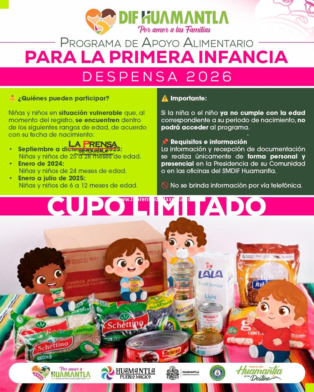 El Ayuntamiento de Huamantla, a través del Sistema Municipal DIF (SMDIF), invita a madres, padres y tutores de las 39 comunidades y la cabecera municipal a participar en el Programa de Apoyo Alimentario para la Primera Infancia, dirigido a niñas y niños en situación de vulnerabilidad.