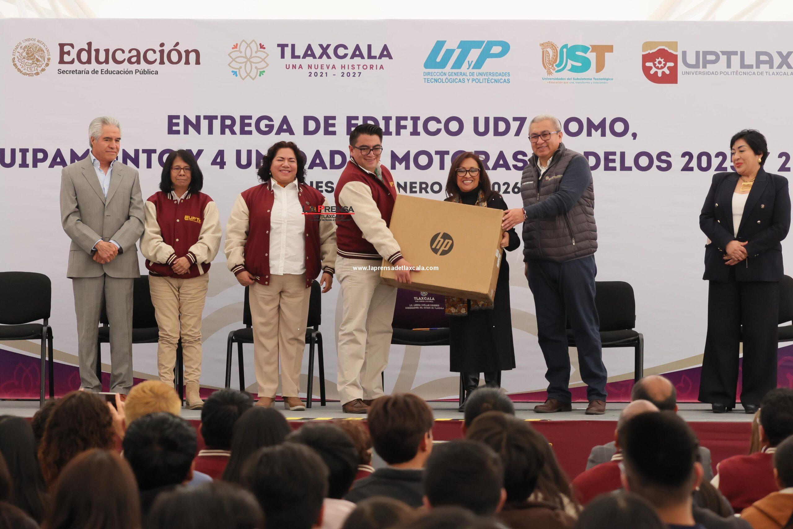 La gobernadora Lorena Cuéllar Cisneros destacó que su administración mantiene como prioridad generar más y mejores oportunidades para las juventudes tlaxcaltecas, durante el acto de entrega del edificio de Unidad de Docencia siete (UD7), un domo, equipamiento especializado y cuatro unidades motoras modelos 2025 y 2026 en la Universidad Politécnica de Tlaxcala (UPTX).