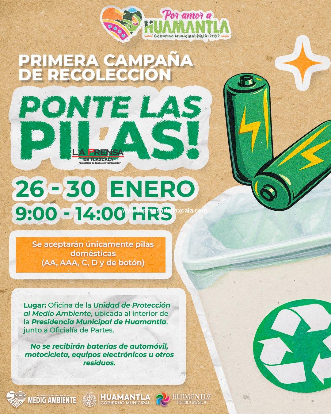 Con el objetivo de fomentar el cuidado del medio ambiente y prevenir la contaminación del suelo y el agua, el Gobierno Municipal de Huamantla, a través de la Unidad de Protección al Medio Ambiente, invita a la ciudadanía a participar en la Primera Campaña de Recolección de Pilas Usadas “Ponte las Pilas”.