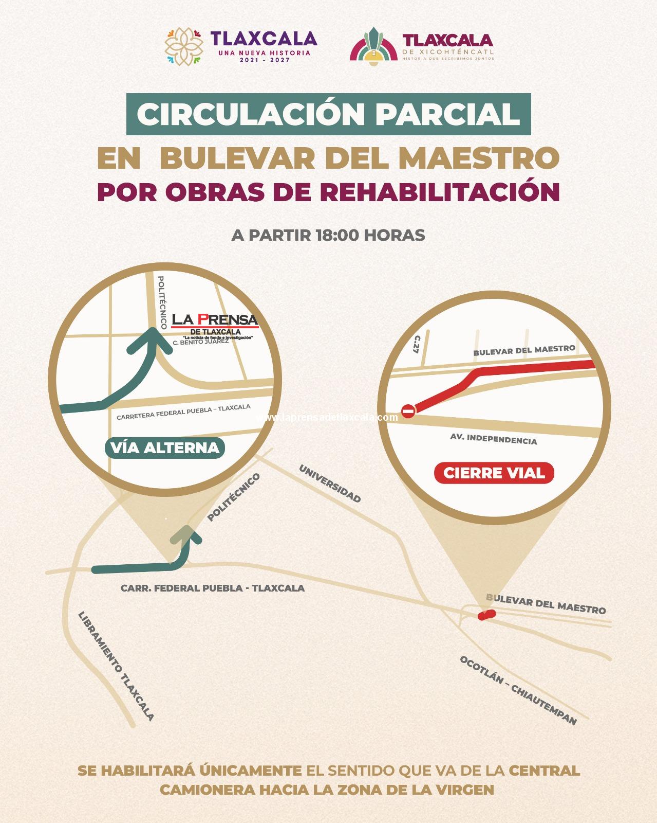 El Ayuntamiento de Tlaxcala informó que, como parte de los trabajos de rehabilitación del Bulevar del Maestro, a partir de este miércoles a las 18:00 horas se implementará una circulación parcial en esta vialidad, por lo que se habilitará únicamente el sentido que va de la Central Camionera hacia la zona de La Virgen.