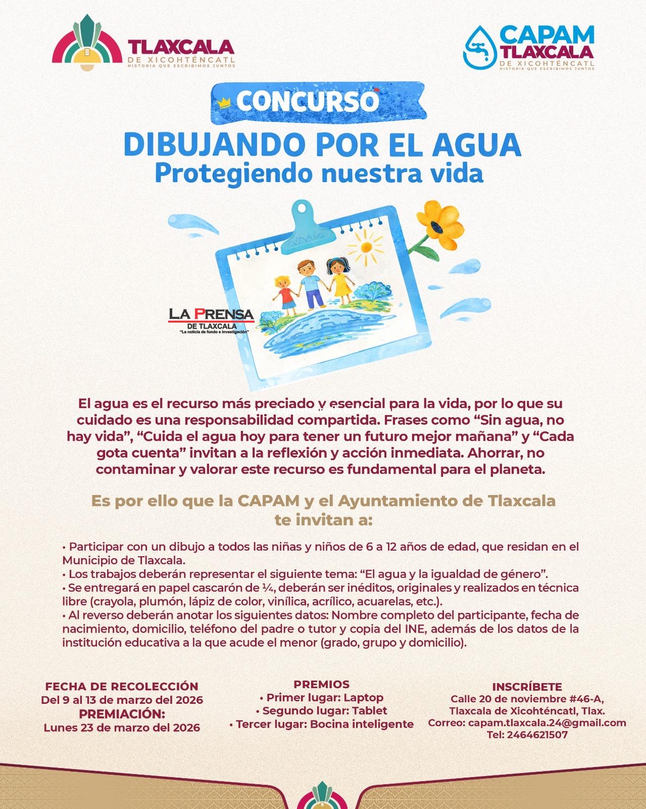 Como parte de las acciones de atención a las causas y el fortalecimiento de los valores ciudadanos, el Ayuntamiento de Tlaxcala, encabezado por Alfonso Sánchez García, a través de la Comisión de Agua Potable y Alcantarillado del Municipio (CAPAM), convoca al concurso infantil “Dibujando por el Agua — Protegiendo nuestra vida”.