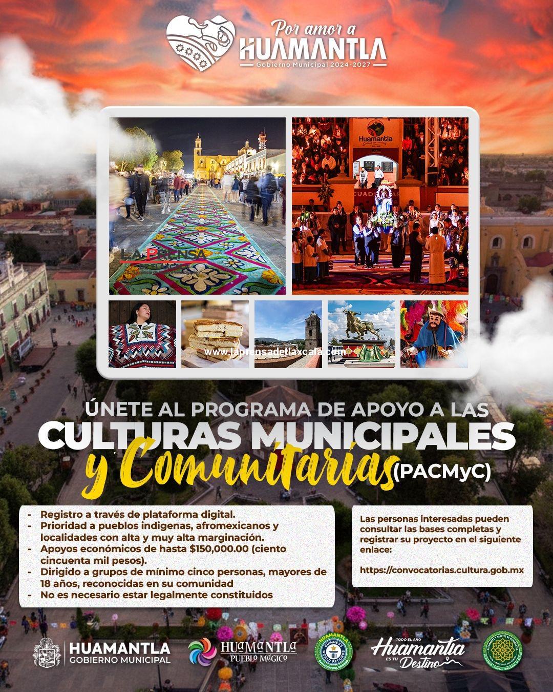 El Gobierno Municipal de Huamantla que encabeza Salvador Santos Cedillo, a través de la Dirección de Turismo, Cultura y Desarrollo Taurino, reitera la invitación a participar en la convocatoria del Programa de Apoyos a las Culturas Municipales y Comunitarias (PACMyC) 2026, emitida por la Secretaría de Cultura.