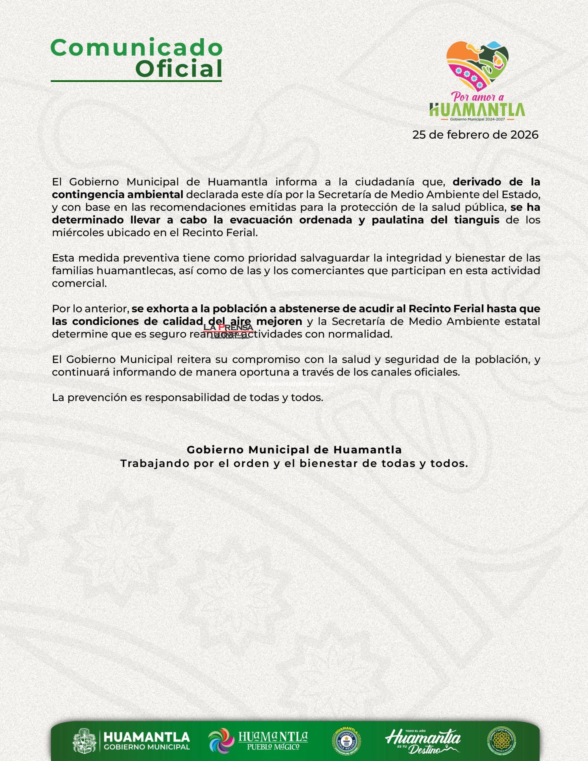 El Gobierno Municipal de Huamantla informa a la ciudadanía que, derivado de la contingencia ambiental declarada este día por la Secretaría de Medio Ambiente del Estado, y con base en las recomendaciones emitidas para la protección de la salud pública, se ha determinado llevar a cabo la evacuación ordenada y paulatina del tianguis de los miércoles ubicado en el Recinto Ferial.