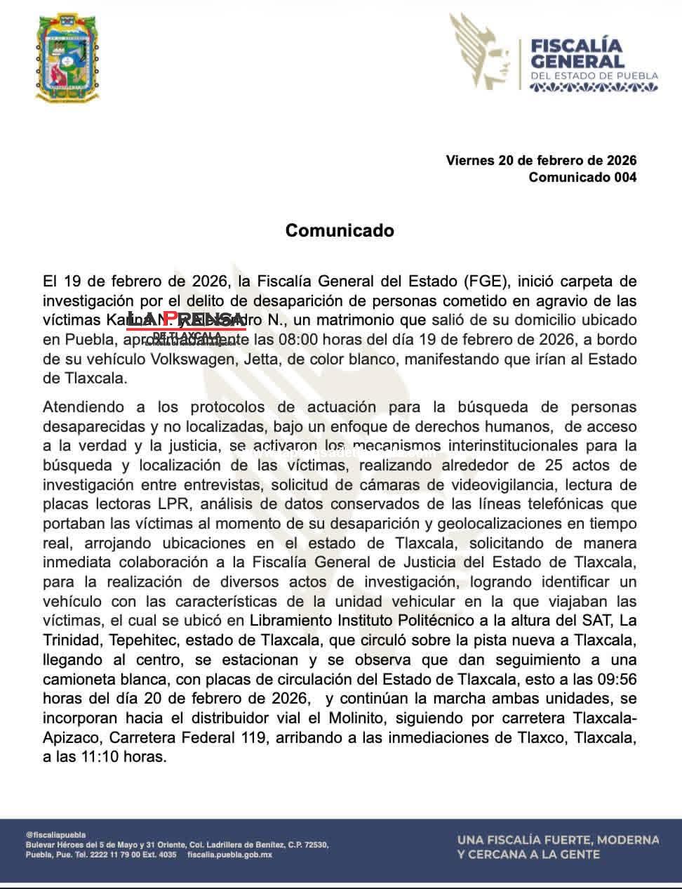 El 19 de febrero de 2026, la Fiscalía General del Estado (FGE), inició carpeta de investigación por el delito de desaparición de personas cometido en agravio de las víctimas Karina N. y Alexandro N., un matrimonio que salió de su domicilio ubicado en Puebla, aproximadamente a las 08:00 horas del día 19 de febrero de 2026, a bordo de su vehículo Volkswagen, Jetta, de color blanco, manifestando que irían al Estado de Tlaxcala.