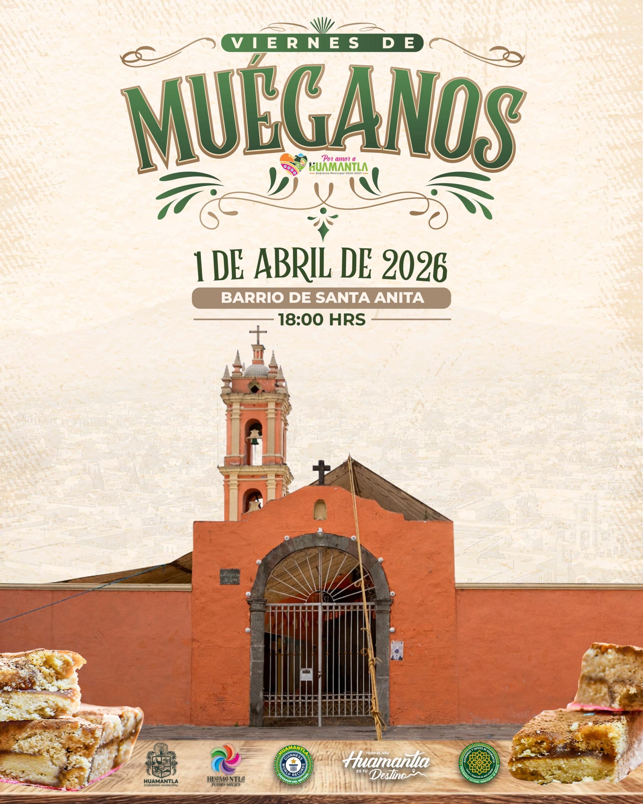 El Gobierno Municipal de Huamantla que encabeza Salvador Santos Cedillo invita a la ciudadanía a disfrutar del “Viernes de Muéganos”, que en esta ocasión se realizará de manera extraordinaria el próximo miércoles 1 de abril en el barrio de Santa Anita, como parte de las actividades que preservan y promueven las tradiciones del municipio.