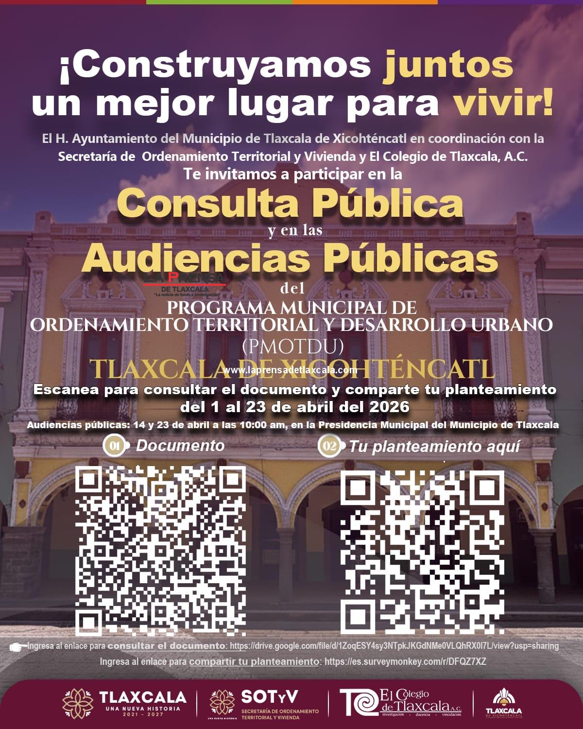 Las y los interesados podrán consultar el documento del programa y también enviar sus planteamientos hasta el 23 de abril, además de participar en las audiencias públicas que se llevarán a cabo del 14 al 23 de abril a las 10:00 horas en la Presidencia Municipal de Tlaxcala, espacio abierto para el diálogo y la construcción colectiva.