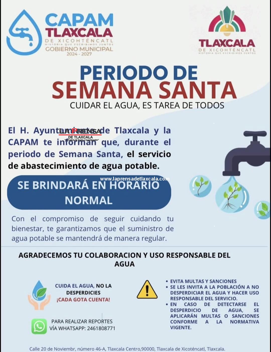El gobierno municipal de Tlaxcala, encabezado por Alfonso Sánchez García, a través de la Comisión de Agua Potable y Alcantarillado del Municipio (CAPAM), hizo un llamado a la ciudadanía a hacer un uso responsable del agua durante el periodo vacacional de Semana Santa, con el objetivo de garantizar el bienestar de las familias.