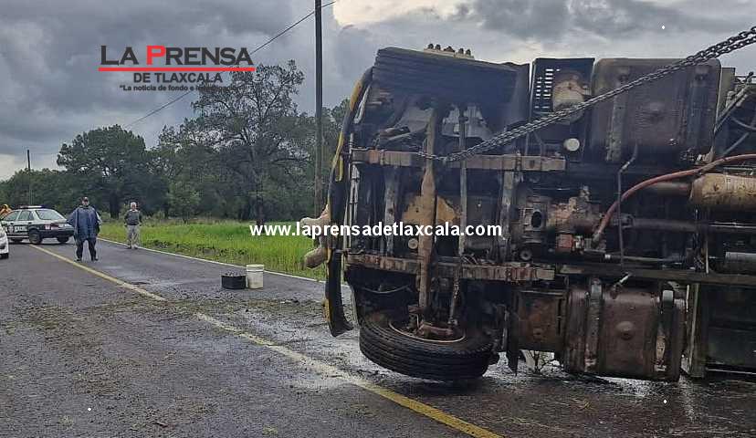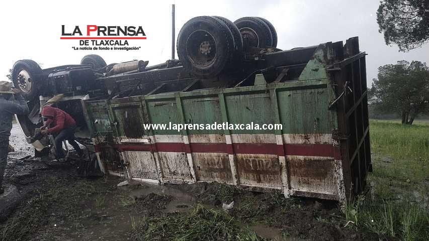 Este miércoles, salvan la vida los tripulantes del camión recolector de basura propiedad del municipio de Muñoz de Domingo Arenas en el estado de Tlaxcala, luego que cargado con derechos sólidos en tránsito por Atlangatepec y con destino al relleno sanitario; a causa de una falla combinada con el mal clima predominante en la zona, perdieran el control y la carretera hasta volcar y quedar ‘llantas arriba’.