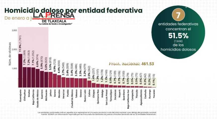 Asimismo, se indicó que siete entidades concentraron el 51.5% de los homicidios dolosos en México: Guanajuato -mil 761-, Chihuahua -mil 069-, Sinaloa -mil 063-, Baja California -mil 052-, Estado de México -974-, Guerrero -870- y Michoacán -820-.