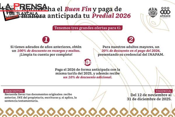 El Gobierno Municipal de Apizaco que preside Javier Rivera Bonilla, a través del Área de Predial, invita a la ciudadanía a aprovechar la Campaña de Pago Anticipado del Predial 2026, que se suma a las promociones de El Buen Fin, ofreciendo importantes descuentos y beneficios para las y los contribuyentes. Esta campaña estará vigente del…
