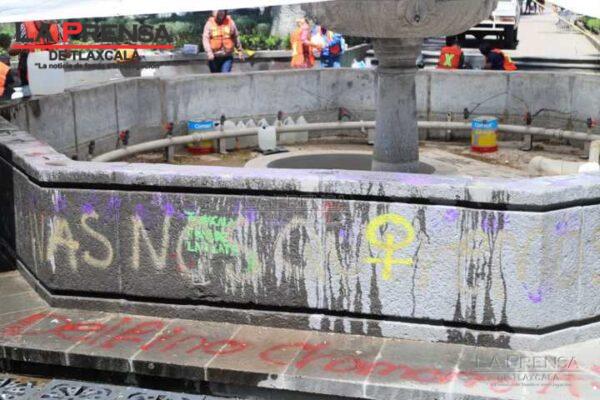 Trabajadores del gobierno estatal de limpieza se dieron a la tarea de restaurar la Fuente de la Santa Cruz, ubicada en la Plaza de la Constitución de la capital tlaxcalteca. La fuente, que es un monumento protegido por el Instituto Nacional de Antropología e Historia (INAH), había sido pintada durante la marcha del 8 de…