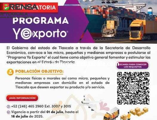 El Gobierno del Estado a través de la Secretaría de Desarrollo Económico impulsa la internacionalización del sector productivo con capacitación y consultoría especializada para la exportación de productos tlaxcaltecas La Secretaría de Desarrollo Económico (SEDECO) lanzó la convocatoria del Programa de Capacitación “Yo Exporto”, dirigido a emprendedores, micro, pequeñas y medianas empresas (MIPyMES) del estado…