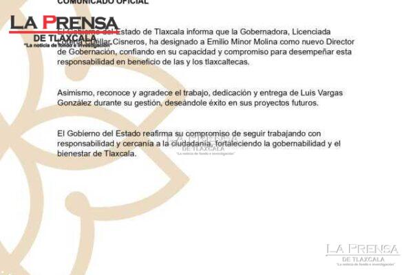 Tlaxcala de Xicohtencatl, Tlax, a 28 de Febrero de 2025. COMUNICADO OFICIAL El Gobierno del Estado de Tlaxcala informa que la Gobernadora, Licenciada Lorena Cuéllar Cisneros, ha designado a Emilio Minor Molina como nuevo Director de Gobernación, confiando en su capacidad y compromiso para desempeñar esta responsabilidad en beneficio de las y los tlaxcaltecas. Asimismo,…