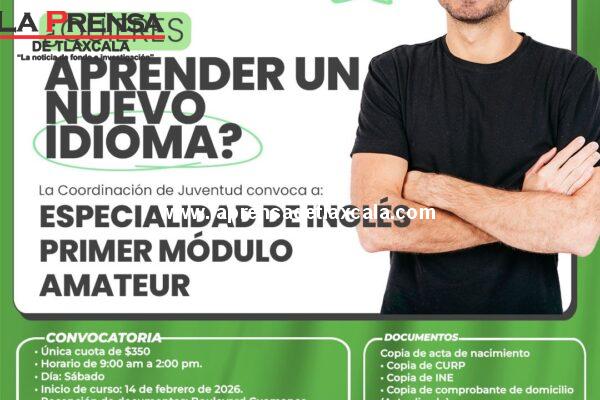 Con el objetivo de fortalecer la preparación académica, ampliar las oportunidades de desarrollo personal y profesional de la juventud huamantleca, el Gobierno Municipal, a través de la Coordinación de Juventud, convoca a cursar la Especialidad de Inglés, Primer Módulo Nivel Amateur. Este curso dará inicio el sábado 14 de febrero de 2026, con un…
