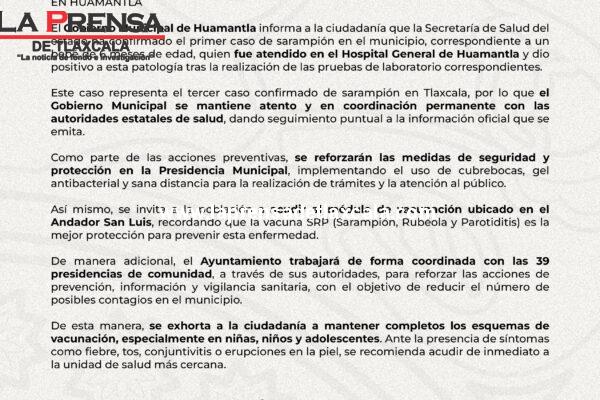 El Gobierno Municipal de Huamantla informa a la ciudadanía que la Secretaría de Salud del estado ha confirmado el primer caso de sarampión en el municipio, correspondiente a un bebé de 6 meses de edad, quien fue atendido en el Hospital General de Huamantla y dio positivo a esta patología tras la realización de las…