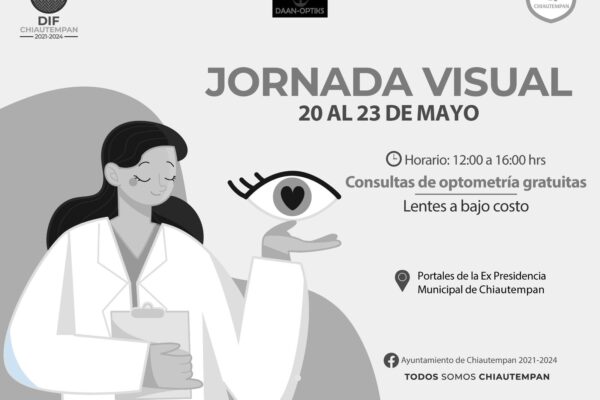 El Ayuntamiento de Chiautempan invita a la población en general a la Jornada Visual, a fin de detectar y atender a personas con baja agudeza visual. Dicha jornada va dirigida a personas de escasos recursos con consultas de optometría gratuitas y la adquisición de lentes a bajo costo para las personas que lo requieran. Cabe…