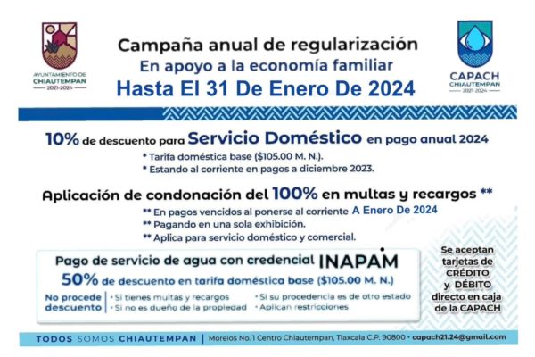 El Ayuntamiento de Chiautempan y la Comisión de Agua Potable del municipio de Chiautempan (CAPACH) invitan a la ciudadanía a los últimos días de la campaña de regularización. La CAPACH informa que las personas tienen hasta el 31 de enero del presente año para hacer valer el 10 por ciento de descuento para servicio doméstico…