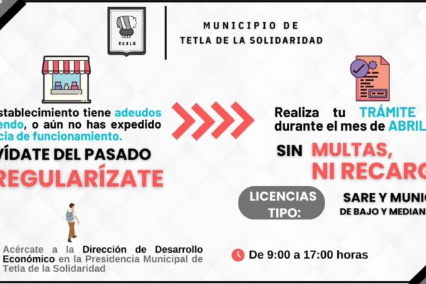 El Ayuntamiento de Tetla de la Solidaridad, exhorta a todos los establecimientos que tengan adeudos en refrendo o que aún no hayan expedido su licencia de funcionamiento, a regularizarse con su trámite 2024, todo el mes de abril, sin multas, ni recargos. En esta ocasión, sólo aplica para licencias tipo SARE y Municipal, de bajo…