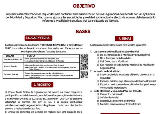 _*Se realizarán en los municipios de Apizaco y Zacatelco los días 17 y 19 de enero_ La Secretaría de Movilidad y Transporte (SMyT) llama a los concesionarios del transporte público a participar en los foros de consulta en materia de movilidad y seguridad vial que convoca el Congreso local, con el propósito de armonizar la…